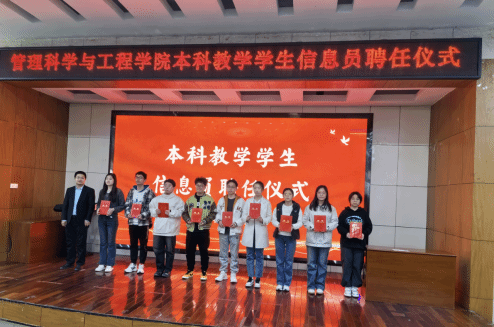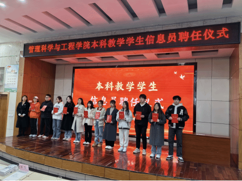 党委副书记陈霞副教授、副院长荆树伟教授、辅导员老师、教师代表及28名本科教学学生信息员、各年级本科生代表参加聘任仪式。