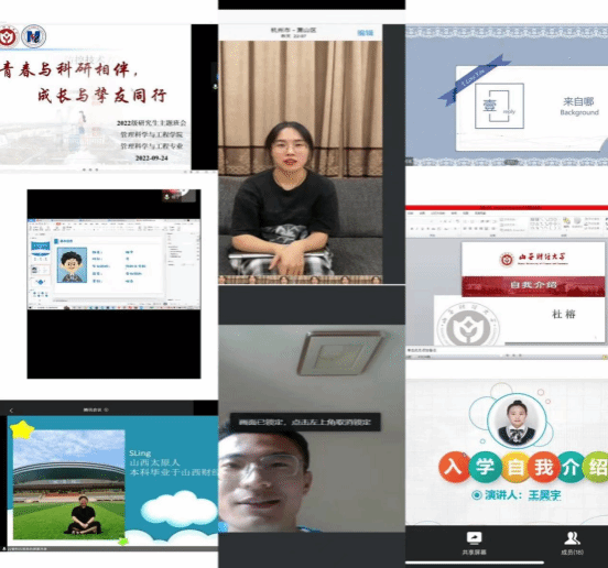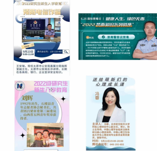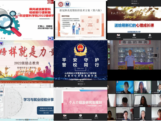 团委书记结合研究生学籍管理及生涯规划,学习了研究生管理手册,引导新生从现在开始规划好自己的研究生活,不负韶华。北京航空航天大学心理咨询中心冯蓉副教授为新生进行心理健康教育,鼓励学生塑造阳光心态 成就更好自己。太原市强制隔离戒毒所管理科长刘利民警官和太原市公安局直属分局指挥室副主任王安瑞警官结合详实的工作案例,分别从禁毒知识和预防电信诈骗为大家上了一堂安全教育课,呼吁大家谨防诈骗、远离毒品,共同为营造和谐平安的校园环境贡献力量。山西省五四青年奖章获得者刘辉结合自己多年的志愿服务经历,号召大家都参与到奉献友爱的志愿服务中。就职于中国烟草的郭彦凯、国家税务总局的任文瑾、阳城县西河乡党办的初雯昕、之江实验室的赵泳琪和在华北电力读博的杨坤,5位杰出校友分别结合自身经历从读博、人才引进、考公、民企等为大家传授经验。9月24日下午的,班级主题班会“青春与科研相伴、成长与挚友同行”,辅导员与大家一同学习了《高校新冠肺炎疫情防控技术方案(第六版)》具体内容。97名同学精心准备了自我介绍与研究生规划,增进了班级凝聚力。