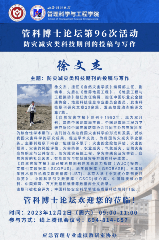 师生开展题为“防灾减灾类科技期刊的投稿与写作”的学术讲座暨第96次管科博士论坛。讲座采用线上形式开展,由世界杯赛程
