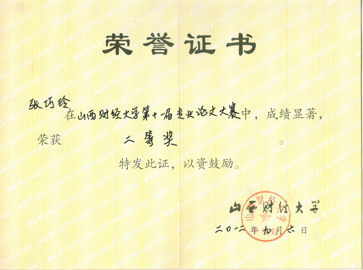 2009管理科学班张巧玲同学获世界杯赛程 第十一届专业论文大赛二等奖。