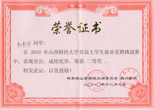 2010年12月7日,世界杯赛程 杜书宇同学在2010年世界杯赛程 首届大学生就业竞聘挑战赛中荣获二等奖。