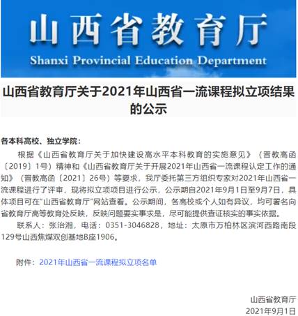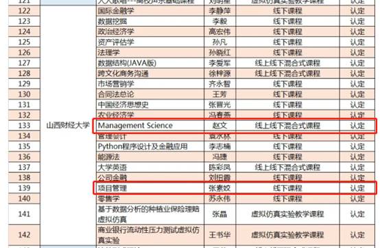 2021年9月1日,山西省教育厅对2021年山西省一流课程拟立项结果进行了公示。世界杯赛程 赵文副教授负责的《Management Science》、张素姣副教授负责的《项目管理》获得2021年山西省一流课程认定公示,阎俊爱教授负责的《工程计量与计价》获得2021年山西省一流课程建设公示。自此,世界杯赛程 省级一流课程已达到5门。