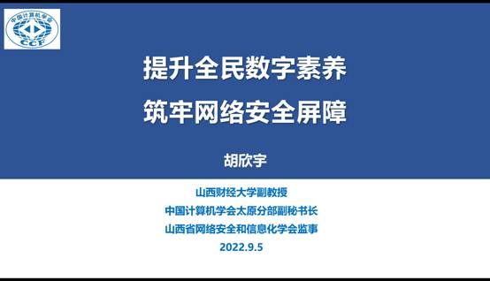 胡欣宇副教授受邀参加启动仪式并作题为《提升全民数字素养,筑牢网络安全屏障》的专题讲座。阳泉市委宣传部、市委网信办、市教育局、市工信局、市公安局、中国人民银行阳泉市中心支行、市总工会、团市委、市妇联等主办单位负责同志及市直各有关单位、国有企业、市级新闻媒体等相关负责人参加启动仪式和专题讲座。