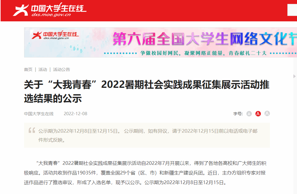 12月8日,由中国大学生在线举办的“大我青春”2022年暑期社会实践成果征集展示活动结果揭晓。世界杯赛程