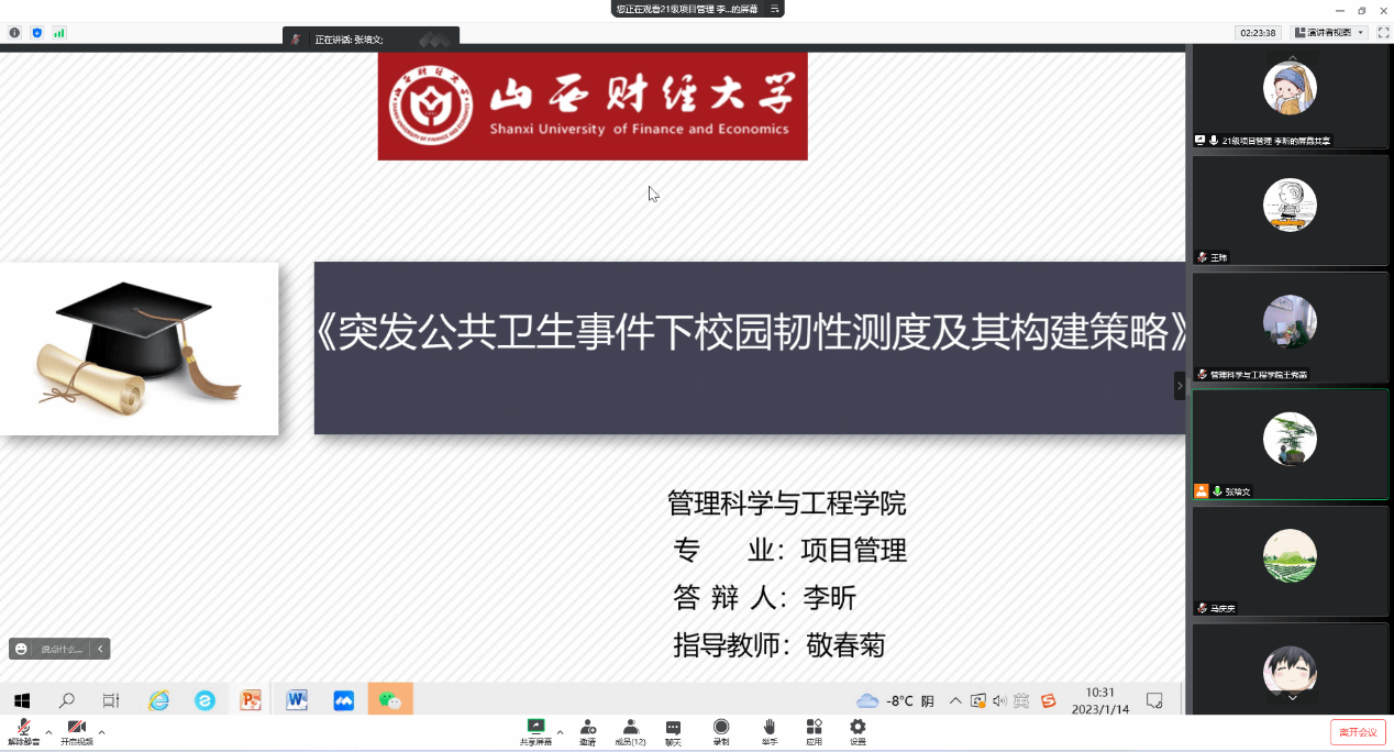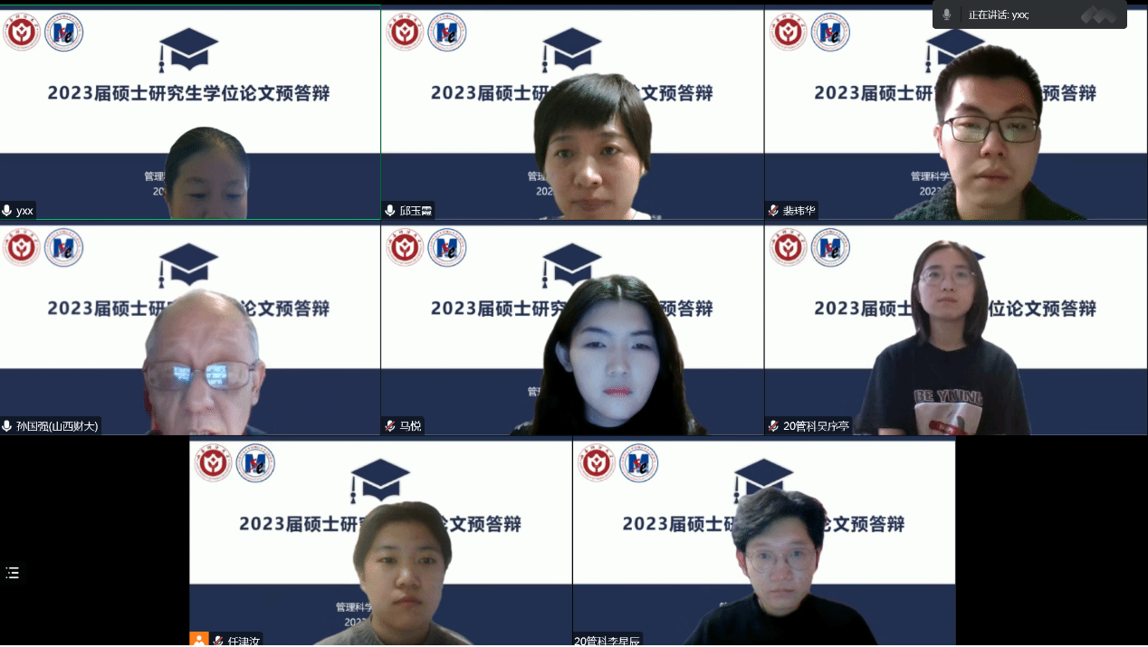 于2023年1月13日、1月14日通过腾讯会议线上举行了2023届硕士研究生学位论文预答辩。2020级管理科学与工程、2021级物流工程与管理、工程管理、项目管理4个专业,105名硕士研究生,近40名教师参加了此次预答辩。