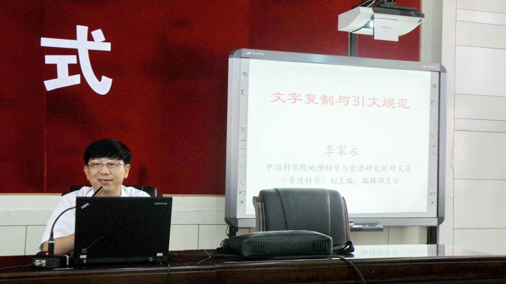 李家永研究员首先给大家介绍了知识的传承和传播以及目前国内流行的文献检测系统,通过对《资源科学》期刊文稿的检测统计,分析了各类机构不同职称作者的文字复制状况,对论文的引用与抄袭进行了解释和界定,随后,李研究员给大家讲解了引文的类型、引用的广度和深度以及期刊的定量测评指标,通过大量数据、图表和图片并结合典型案例为大家深刻的剖析了如何“合理引用”以及引文的规范,语言通俗易懂,幽默风趣,赢得了大家的阵阵掌声。最后,李家永研究员与在场同学就自引、二次文献的引用、原著思想的引用等进行了深入热烈的讨论。