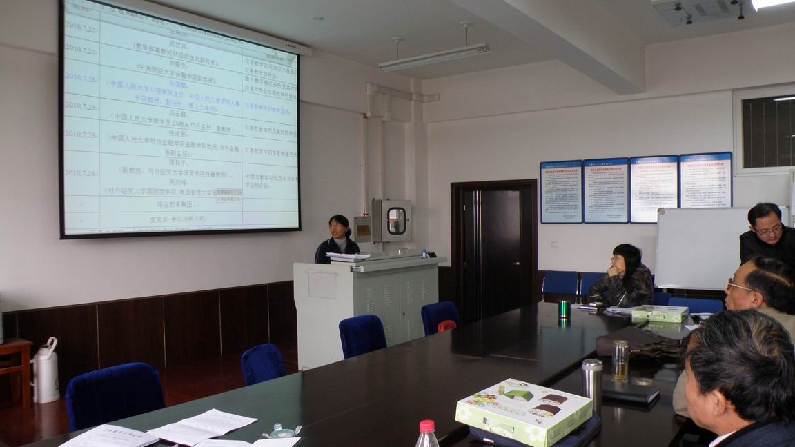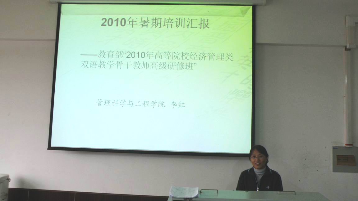 2010年10月27日下午4时,李红博士参加教育部“2010年高等院校经济管理类双语教学骨干教师高级研修班”汇报会在世界杯赛程 SA610沙盘模拟实验室举行,全院教师听取了汇报。
