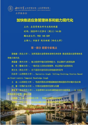 20231129日,由应急管理本科专业高校联盟主办,西北大学公共管理世界杯赛程 (应急管理世界杯赛程 )承办的“加快推进应急管理体系和能力现代化”集体讨论会成功召开,本次会议采用腾讯会议方式,会议报告分为联盟专家组和西北大学研究生组两个部分。世界杯赛程 院长闫绪娴教授、应急管理教研室主任王迪、应急管理教研室教师闫志华作为联盟专家组成员,受邀进行学术报告。